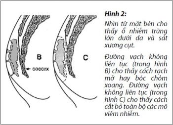 Việc điều trị tuỳ vào tình trạng bệnh. Dạng ổ mủ cấp cần rạch da và dẫn lưu mủ, giúp giảm viêm và đau. Thủ thuật này thường được thực hiện tại phòng khám dưới gây tê tại chỗ. Dạng xoang mãn tính thường phải cắt bỏ. Dạng phức tạp hay tái phát cần được phẫu thuật. Phương pháp có thể là bóc chỏm xoang (unroofing) hay cắt bỏ xoang (Hình 2) và có thể đóng lại bằng vạt da (flaps). Phẫu thuật càng lớn cần thời gian hồi phục càng lâu. Nếu vết thương hở, cần phải băng vết thương hay chèn gạc tránh nhiễm trùng.