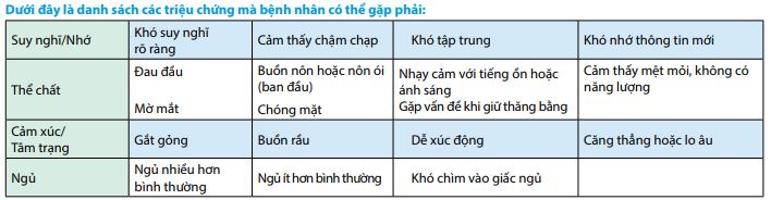Bệnh nhân có thể mất một thời gian để não hồi phục. Trong khoảng thời gian này, bệnh nhân thường gặp các cơn đau đầu và các rối loạn nhận thức ở mức độ nhẹ (như khó tập trung, khó nhớ thông tin, khó thực hiện các công việc phức tạp, và thay đổi tâm trạng). Đây cũng là điều bình thường nếu bệnh nhân cảm thấy mệt mỏi hơn thường lệ.