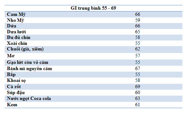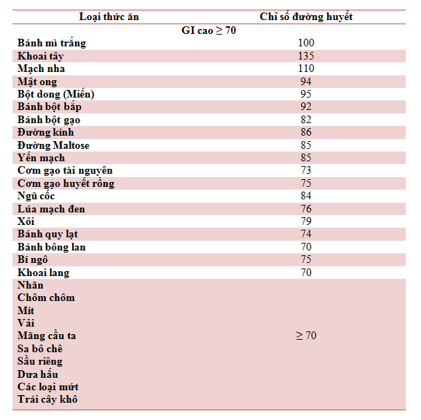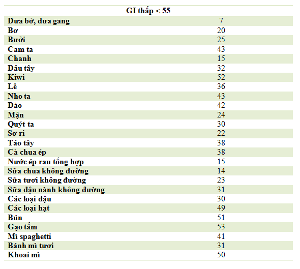 BẢNG CHỈ SỐ ĐƯỜNG HUYẾT (GI) CỦA MỘT SỐ THỰC PHẨM