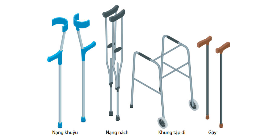 Dụng cụ trợ giúp đi phổ biến nhất là nạng khuỷu, nạng nách, khung tập đi và gậy. Tuy nhiên, chuyên viên vật lý trị liệu có thể cung cấp nhiều dụng cụ trợ giúp đi chuyên dụng khác về kích thước, chất liệu và tính năng bổ sung. Đừng ngần ngại liên hệ với chuyên viên vật lý trị liệu để biết thêm thông tin.