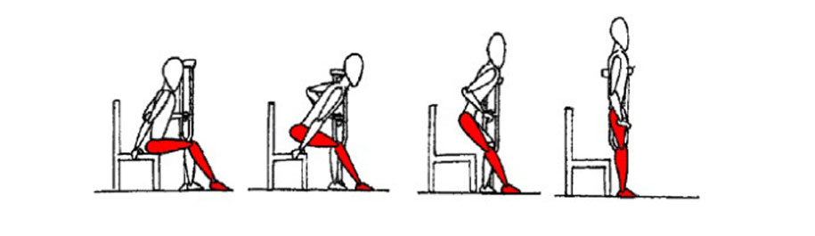 - Hai tay giữ ghế hoặc tay vịn. Cúi người về phía trước và tự đẩy người đứng dậy. Chuyển trọng lượng lên tay để đứng lên bằng “chân khỏe”;