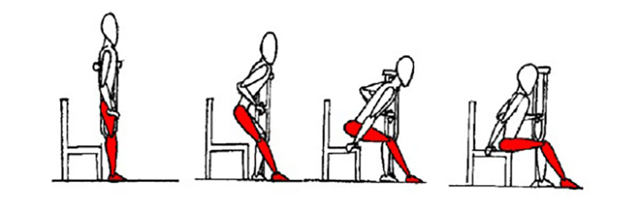 - Nhẹ nhàng gập người về phía trước đồng thời co khớp gối của “chân khỏe”. Chuyển trọng lượng lên tay khi ngồi xuống.