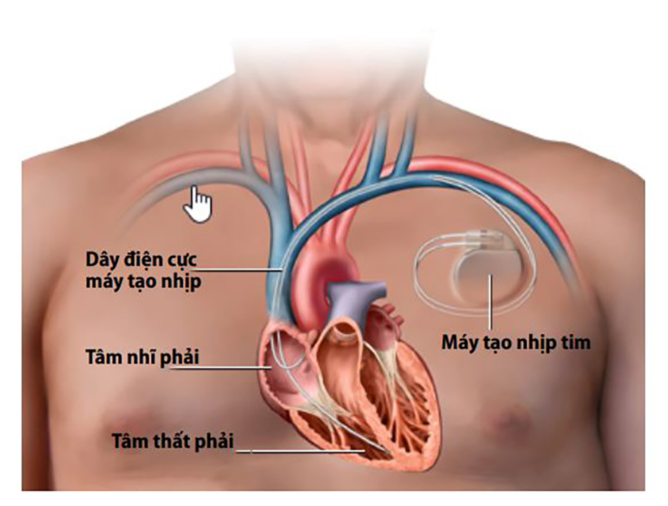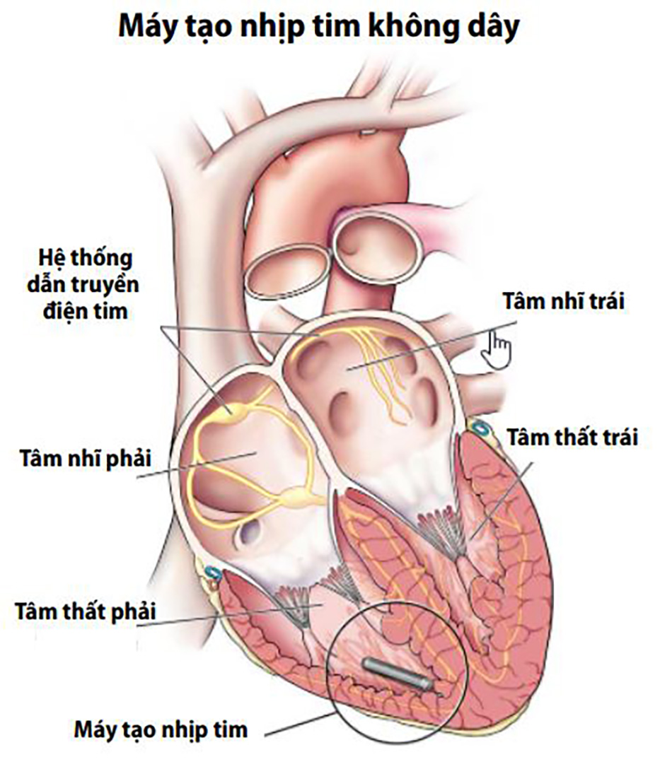 - Cấy máy tạo nhịp tim: Đặt một thiết bị nhỏ dưới da vùng ngực trên hoặc cấy một máy tạo nhịp không dây rất nhỏ vào bên trong buồng tâm thất phải. Thiết bị này thường được chỉ định trong trường hợp bị bloc tim hoàn toàn và các tình trạng bệnh lý cụ thể khác. Sau khi cấy ghép, máy tạo nhịp giúp điều chỉnh nhịp tim bằng cách phát các xung điện, giúp duy trì nhịp tim bình thường và đều đặn.