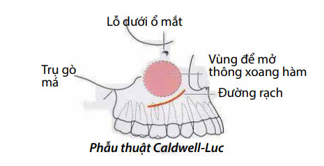 Phẫu thuật nội soi mũi xoang có thể không dẫn lưu được hoàn toàn dịch nhầy, cắt bỏ niêm mạc bị bệnh hoặc các polýp trong xoang. Trong trường hợp này, bác sĩ phẫu thuật quyết định mở xoang qua hàm là cần thiết. Thủ thuật này gọi là phẫu thuật Caldwell-Luc (mở thông xoang hàm trong miệng), được thực hiện bằng cách rạch một đường nhỏ giữa môi trên và nướu rồi cắt bỏ một mảnh xương nhỏ ra khỏi thành trước của xoang hàm.