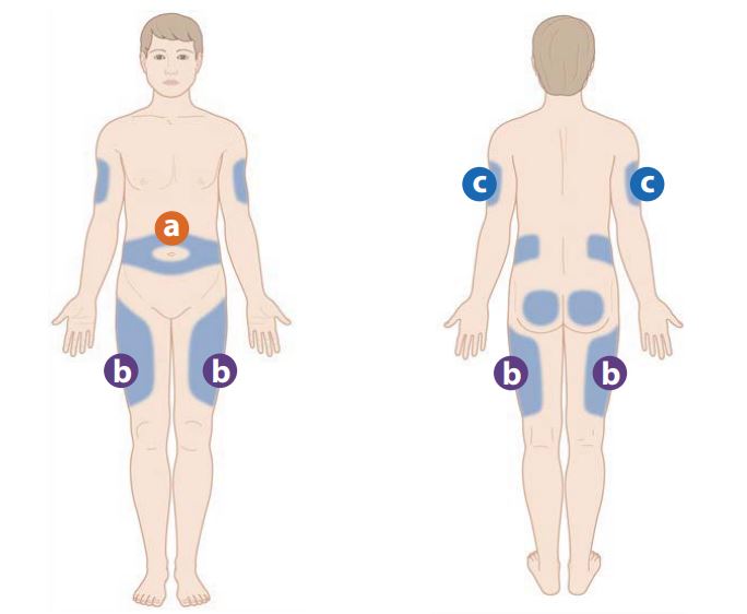 • Vị trí tiêm: insulin được tiêm vào những mô mỡ ở bụng (1), ở hai bên đùi (2), mông trên hoặc mặt sau của cánh tay (3). Vài ngày thì đổi chỗ tiêm để thuốc được hấp thụ tốt nhất và tránh tạo mô mỡ.