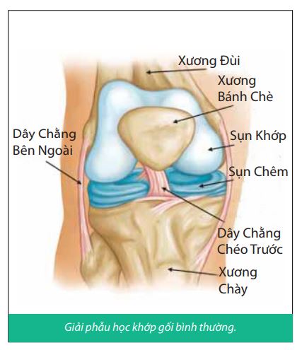 Khớp gối được cấu tạo từ đầu dưới của xương đùi, đầu trên của xương chày và xương bánh chè. Nơi tiếp giáp của ba loại xương này được bao phủ bởi sụn khớp trơn láng để bảo vệ xương và giúp xương cử động dễ dàng.