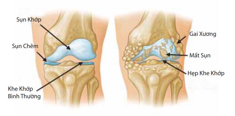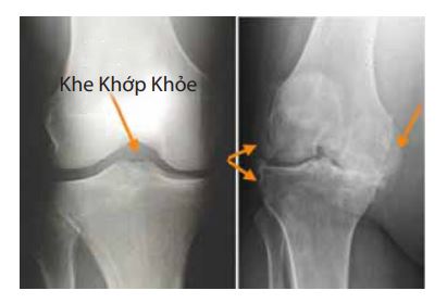 (Trái) Hình ảnh X-quang của khớp gối bình thường, khe giữa các xương cho thấy sụn khỏe mạnh (mũi tên). (Phải) Hình ảnh X-quang của khớp gối bị viêm cho thấy mất khe khớp và gai xương nặng (mũi tên).