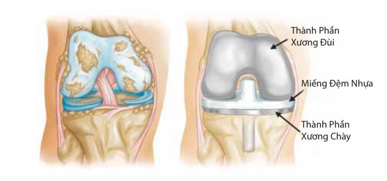 (Trái) Viêm xương khớp nặng. (Phải) Sụn khớp và xương dưới sụn đã được loại bỏ và tái tạo bằng vật liệu cấy ghép kim loại trên xương đùi và xương chày. Miếng đệm nhựa được đặt giữa các vật liệu cấy ghép. Thành phần xương bánh chè không hiển thị rõ ràng.