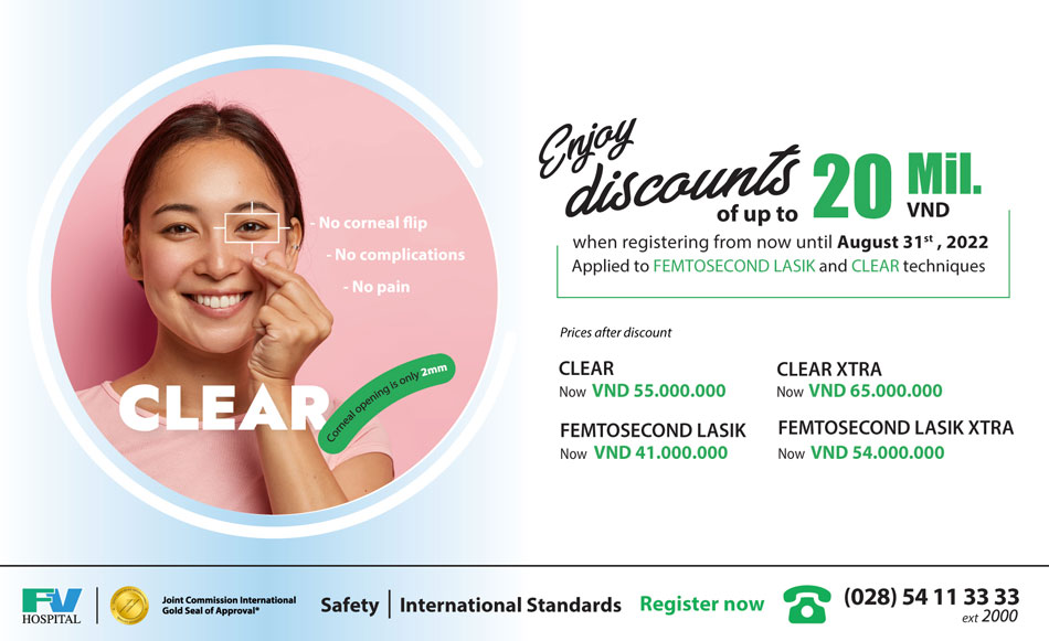 Please call FV Hospital's Department of Ophthalmology and Refractive Surgery at (028) 35 11 33 33, extension 2000, to book an appointment and learn about current special offers.
