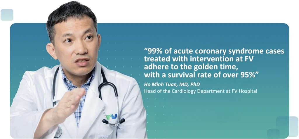 According to international regulations, the time from when a patient with coronary artery disease and acute myocardial infarction arrive at the emergency department until the end of the intervention must be under 90 minutes. However, FV Hospital sets a higher standard, aiming to reduce this time to less than 70 minutes. This includes the time from arrival at the emergency department to entering the Cathlab in just over 10 minutes, and completing stent placement in less than 25 minutes. To achieve the shortest possible time, each team operates as if they are in a “Formula 1 track team”, meticulously handling each step and mutually supporting each other to ensure that patients receive timely treatment, 24 hours a day.