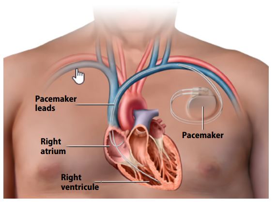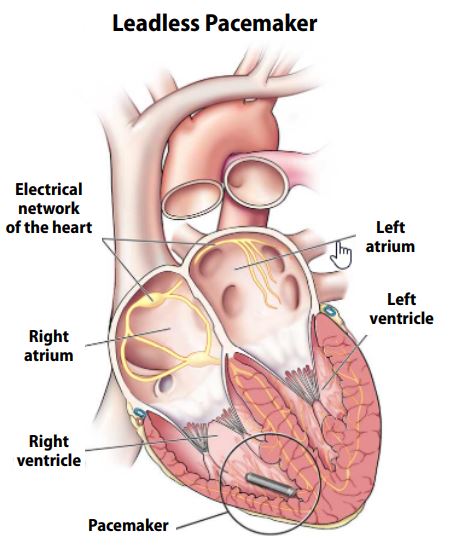 - Pacemaker implantation: this involves the insertion of a small device under the skin on the upper chest or a small tiny leadless pacemaker inside the right ventricle chamber. It is typically used in case of complete heart block and other specific conditions. Once implanted, the pacemaker helps regulate the heartbeat by delivering electrical impulses to maintain a normal and regular rhythm. Please refer to our brochure ‘Pacemakers’.