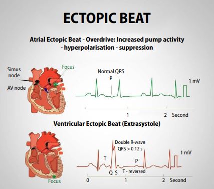 - Ectopic beat (premature complex): these are extra heartbeats which occur out of rhythm with the normal heartbeat. They are very common and are usually harmless also you may feel a sudden pounding in the chest.