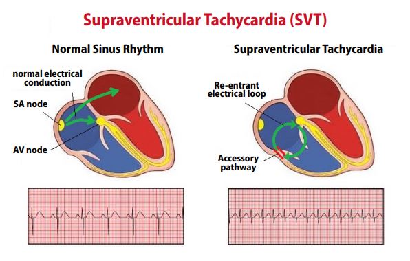 - Supraventricular tachycardia (SVT): is a very fast heart rhythm. Most are due to electrical impulses not travelling normally from the top chambers of the heart to the bottom chambers of the heart.
