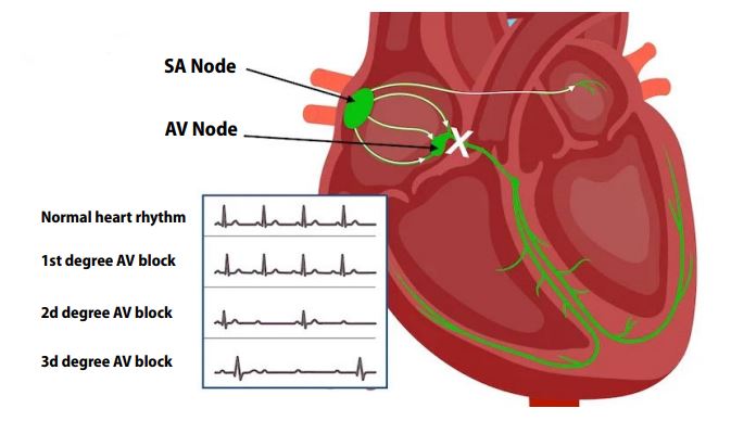 - Ageing (age-related degeneration) around the conducting fibres may cause complete heart block.