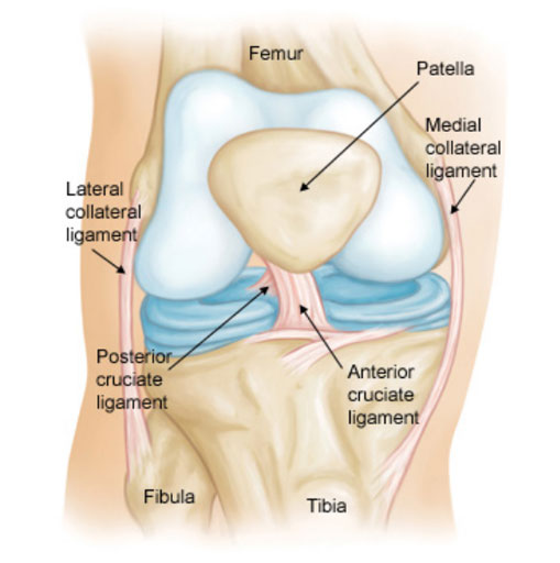 The knee is essentially a hinged joint that is held together by the Medial Collateral (MCL), Lateral Collateral (LCL), Anterior Cruciate (ACL) and Posterior Cruciate (PCL) Ligaments. The ACL runs diagonally in the middle of the knee, preventing the tibia from sliding out in front of the femur, as well as providing rotational stability to the knee.