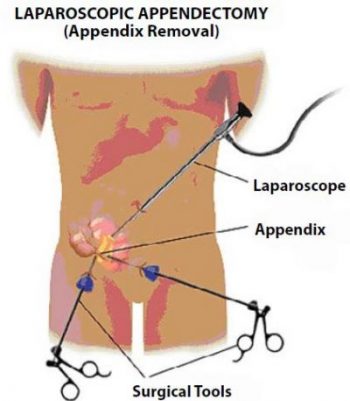 Appendectomy can be performed as open surgery using one abdominal incision about 5 to 10 centimeters long (laparotomy). Or the surgery can be done through a few small abdominal incisions (laparoscopic surgery). During a laparoscopic appendectomy, the surgeon inserts special surgical tools and a video camera into your abdomen to remove your appendix.