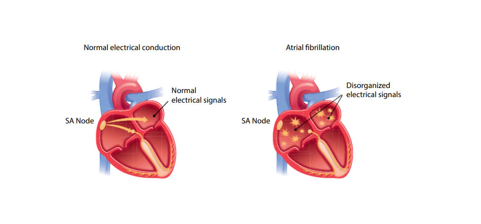 In AF, there are abnormal electrical impulses in the atria, ‘waves’ of uncontrolled electrical signals travel through the atria, rather than the normal, highly regulated signals from the sinus node. These signals cause the muscle fibres in the atria to contract out of time with each other, and the atria ‘quiver’ (or, in medical terms, ‘fibrillate’). Some of this abnormal electrical activity is passed on to the ventricles, causing a rapid and irregular heartbeat.