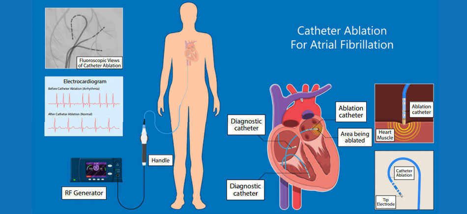 This ablation is a non-surgical procedure. A long, thin tube (or ‘catheter’) is inserted into a blood vessel in your groin and moved into your heart. The electrode at the tip of the catheter senses your heart’s electrical signals and takes electrical measurements. Your doctor tests your heart and then ‘ablates’ sections of the muscle tissue using the catheter. Catheter ablation can be done using: