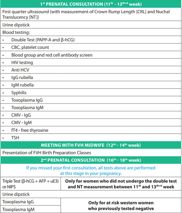 FV Hospital’s pregnancy follow-up consultations are scheduled at key stages of your pregnancy, and the first consultation included in the follow-up package takes place between the 11th and 13th+6 week (which means 13 weeks and 6 days) of gestation, counted from the first day of your last period.