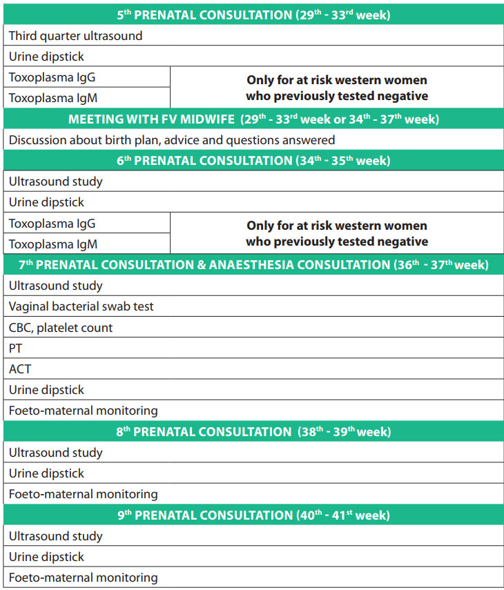 You will see a FVH anaesthetist once you reach the 36th week of your pregnancy (around one month before you are due to deliver). During this consultation, the anaesthetist will explain obstetric pain control techniques and indicate some tests (at the minimum complete blood cell and platelet count, coagulation tests, urine dipstick). Pre-anaesthesia tests must be conducted less than one month prior to delivery.