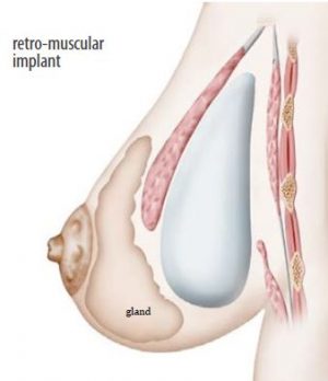 - This can be in a pocket made in the breast tissue behind the mammary gland and in front of the pectoral muscle,