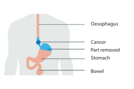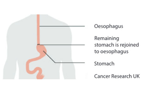 If the cancer is in the lower part of the oesophagus (near the stomach) or at the place where the oesophagus and stomach meet, the surgeon will remove part of the stomach, the part of the oesophagus containing the cancer, and about 8 to 10 centimetres of normal oesophagus above this. This is an oesophagogastrectomy. Then the stomach is connected to what is left of the oesophagus either high in the chest or in the neck.
