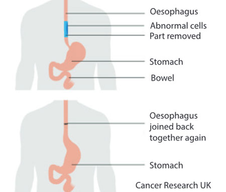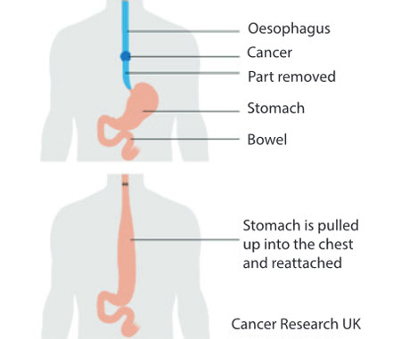 This operation is for when the cancer is only in the oesophagus. The surgeon removes the cancer and some surrounding healthy tissue. They then rejoin the healthy part to your stomach and pull it up into the chest.