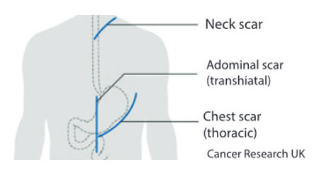 - If the main incisions are in the abdomen and neck, it is called a trans-hiatal oesophagectomy;