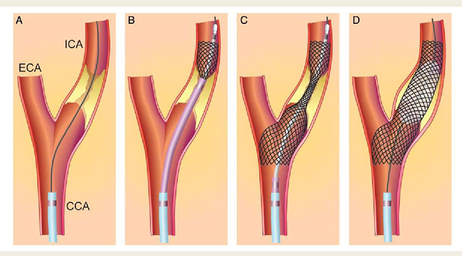 Endovascular therapy involves using a balloon or stent to push open the wall of the artery from within. In the carotid artery, a stent is usually placed to open the narrowing. First, the doctor places an umbrella-like device beyond the narrowed segment to catch any debris that floats off when the stent is put in. Once the stent has been positioned the umbrella is closed and removed from the artery.