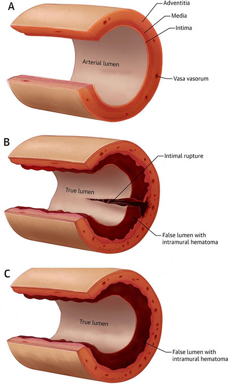The artery walls are made up of three layers of different types of tissue, each with a specific function. Dissection occurs when a tear in the artery wall allows blood to leak between the layers and separate them.
