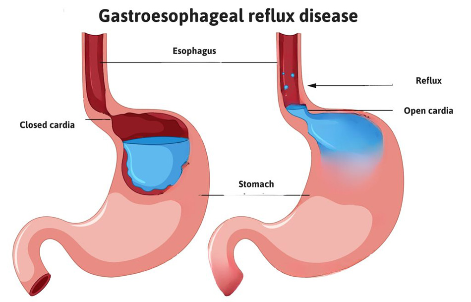 Illustration showing a normal stomach (left) with a closed cardiac sphincter, and a stomach with an open cardiac sphincter (right) leading to gastro-oesophageal reflux disease (GERD).