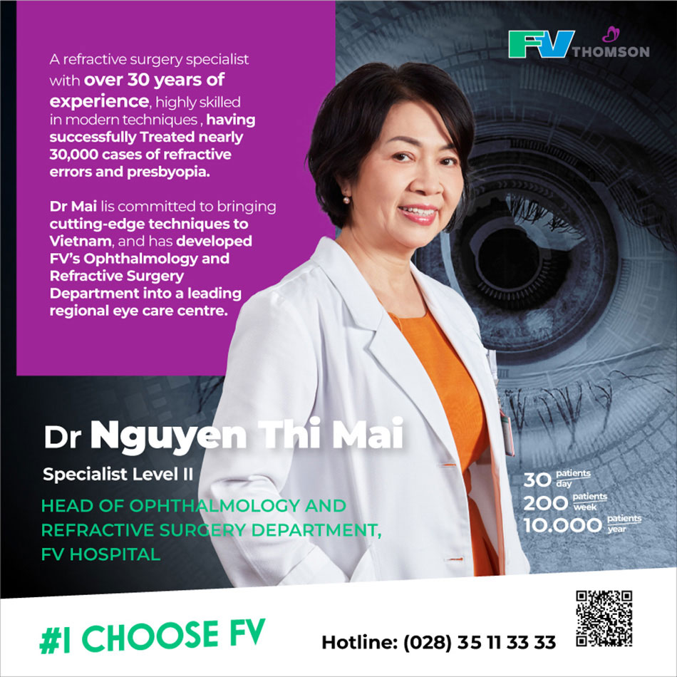 - Dr Nguyen Thi Mai, Specialist Level I, Head of the Ophthalmology & Refractive Surgery Department at FV, is a seasoned expert with over 30,000 successful refractive surgeries, and will personally perform your procedure.
