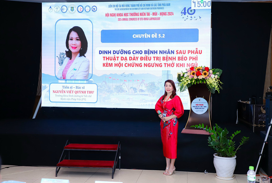 Addressing the topic of care for patients undergoing ear, nose, and throat treatment through surgical methods, Nguyen Viet Quynh Thu, MD, MSc, Specialist Level II, Head of the Dietetics & Nutrition Department at FV Hospital, presented a report on “Nutrition for postoperative gastric patients with obesity and obstructive sleep apnoea syndrome.” Obesity is the primary cause of obstructive sleep apnoea syndrome (OSA), with up to 70 per cent of OSA patients being obese.