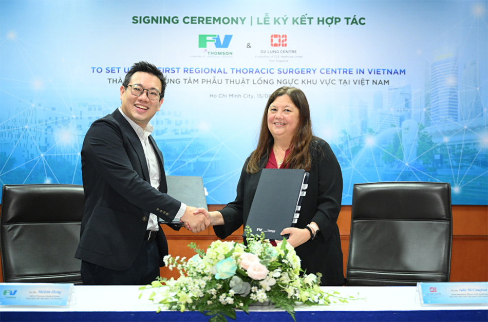 Dr Melvin Heng, CEO of Thomson Medical Group and Ms Julie Mc Caughan – COO of OUE Healthcare Limited signed a memorandum of cooperation to establish the Thoracic Surgery Center at FV Hospital
