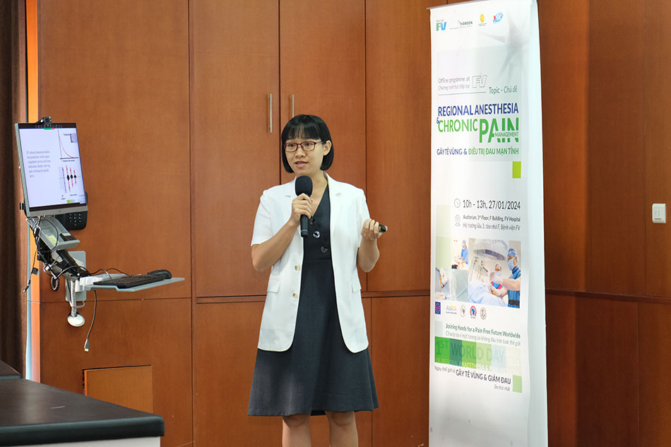 Next, Dr Ly Quoc Thinh, Specialist Level II (Head of the Anaesthesiology & ICU Department, FV Hospital) presented the process of establishing regional anaesthesia services at FV Hospital. In this regard, FV performs regional anaesthesia procedures either in a specialised room in the preoperative area or in the recovery room for surgical patients, and rarely in the operating room. Since 2016, FV has invested heavily in ultrasound equipment, anaesthesia needles, and related support tools to serve regional anaesthesia techniques. Top-quality pharmaceuticals that are rarely used in Vietnam, such as sterile gel, are also employed by FV for these techniques.