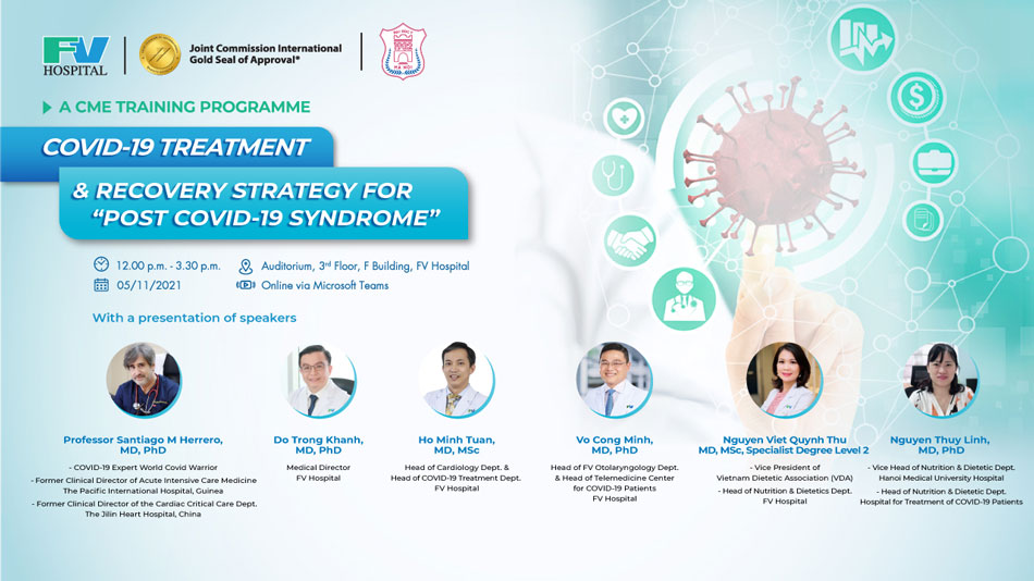 In the afternoon of November 5, 2021, FV Hospital organised the continued medical education (CME) training programme “COVID-19 Treatment and Recovery Strategy for Post-COVID-19 Syndrome” in the Auditorium, third floor, F Building, FV Hospital. The training session was also livestreamed via Microsoft Teams.
