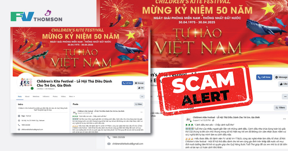Specifically, a Fanpage titled “Children’s Kite Festival – Lễ Hội Thả Diều Dành Cho Trẻ Em, Gia Đình” has been found using FV Hospital’s and the Children’s Health Foundation’s names and branding to promote a festival and call for support and donations. We would like to firmly state that FV Hospital is not involved in, nor has authorised or collaborated on any event under this name. We are currently working with the relevant authorities to investigate and address this act of impersonation.