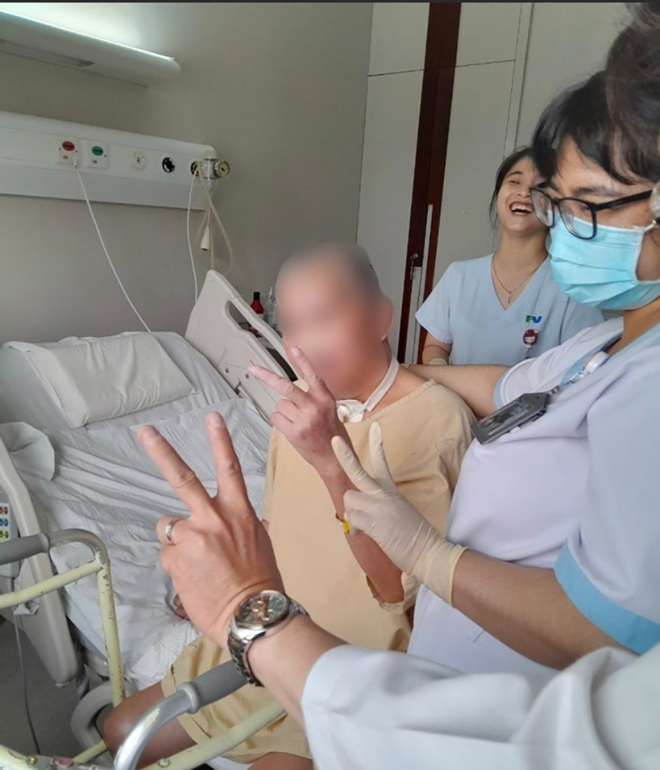 Typically, patients who are hospitalised for an extended period face several risks, such as bedsores, infections, and pneumonia. The FV nursing staff provided meticulous care for Mr V, to prevent bedsores and reinfection. They regularly turning him and took him outside for sunlight exposure daily. Many staff members were accustomed to seeing a nursing team from the General Surgery Department pushing a patient in a wheelchair to the terrace for a walk at 10 a.m. This walk was always accompanied by essential emergency equipment, such as a resuscitation bag and an oxygen tank. “The patient’s condition was fragile and could worsen at any moment, so we always have contingency plans,” explained Ms Na.