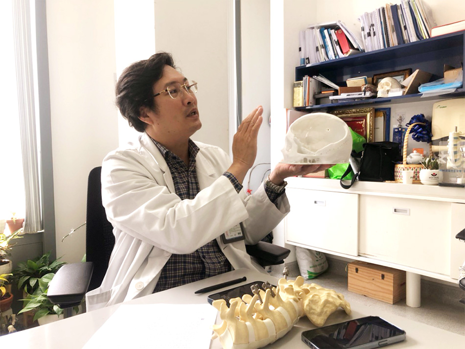 The patient underwent a CT scan of the skull to accurately measure the 3D image of the skull defect area. These parameters were used to create a prosthetic skull piece that perfectly matched the size and shape of the patient’s skull defect.