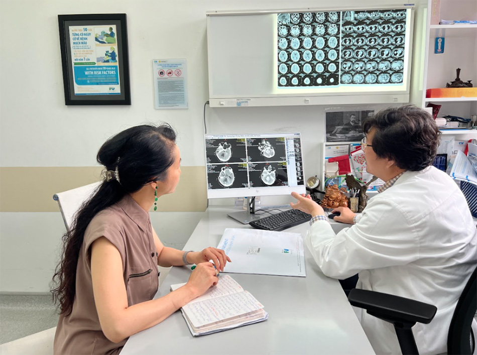 After undergoing two surgeries, the patient began to regain some function, such as naturally opening his eyes, having pain reflexes, sensing those around him, and following commands like opening his mouth and sticking out his tongue. Mrs Hanh recalls, “When I told a funny story, my husband was half asleep, and I saw him smile faintly. Observing those little things made me very happy!”