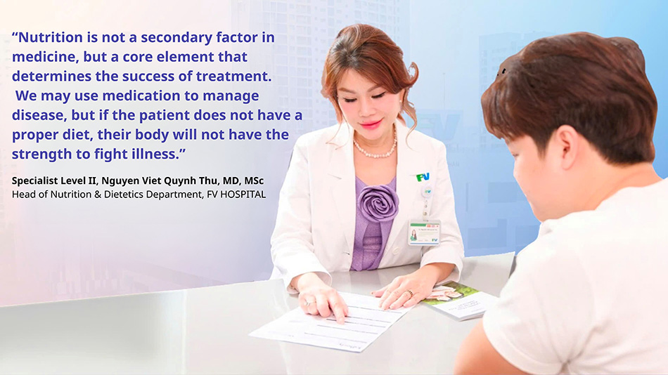With over 20 years of experience in clinical nutrition, Dr Nguyen Viet Quynh Thu affirms that nutrition is not merely a supportive measure – it plays a decisive role in treatment and directly influences patient outcomes. Whether it’s post-surgery recovery, maintaining physical strength in cancer patients, or managing blood sugar levels in individuals with cardiovascular disease or diabetes, a well-structured diet is essential and integral to the healing process.