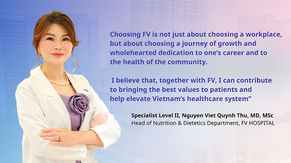 One of the things that brings Dr Thu the greatest joy is witnessing the positive transformation of her patients after receiving proper nutritional counselling and treatment. In 2017, Dr Nguyen Viet Quynh Thu joined FV Hospital to take the next step in her career. In a short time, she has elevated the hospital’s Dietetics & Nutrition Department to a new level of excellence.
