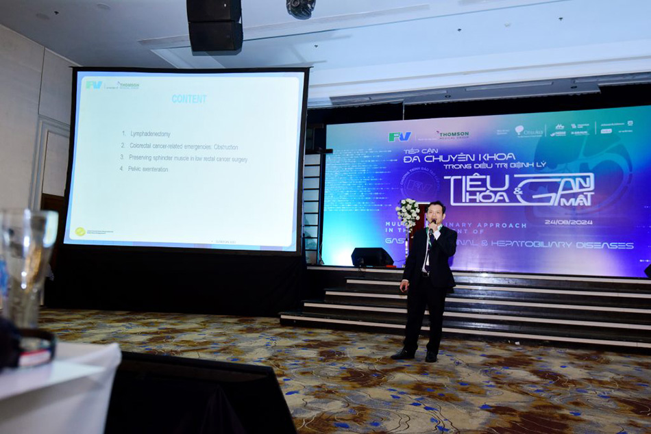 Specialist Level II, Phan Van Thai, MD, MSc, Head of General Surgery at FV Hospital, provided updates on the latest advancements in surgical treatment for colorectal cancer. He introduced the D3 lymph node dissection technique, a more complex but highly effective method for treating colorectal cancer at FV Hospital. Dr Thai also discussed sphincter-sparing techniques in the treatment of low rectal cancer, as well as options for colon resection, stent placement, or creating a permanent colostomy based on the patient’s condition and preferences. Additionally, Dr Thai cited several specific cases, including the treatment of low rectal cancer with pelvic herniation, following the protocol of the Japanese Society for Colorectal Cancer and Rectal Cancer (JSCCR).