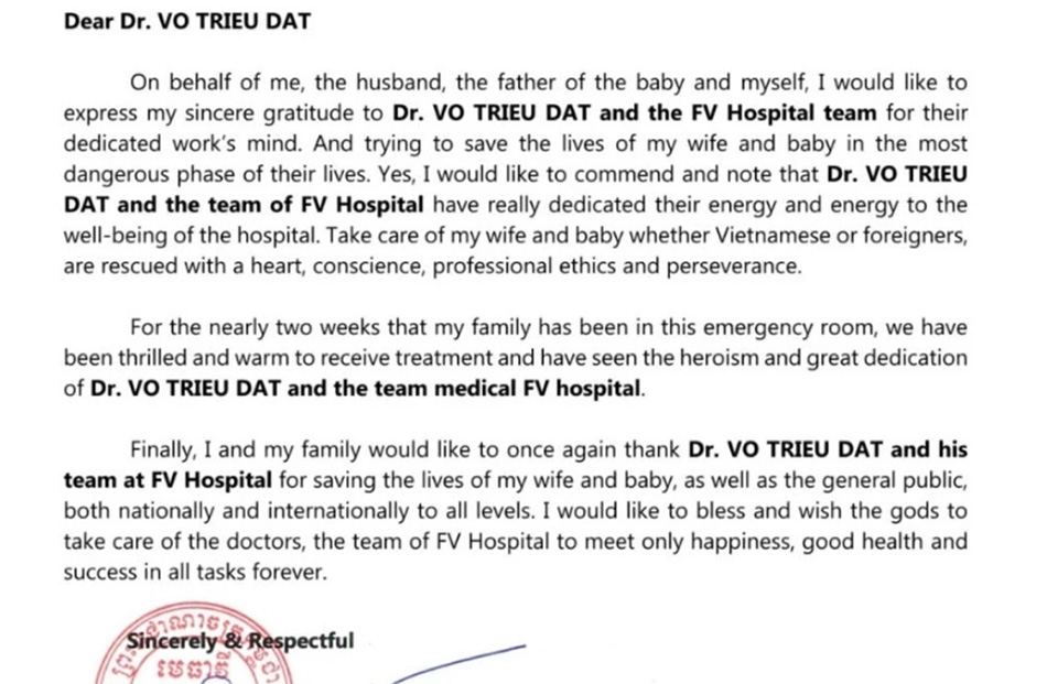 Late one evening in September, a notification appeared on the Zalo account of Vo Trieu Dat, MD, MSc, Head of Obstetrics & Gynaecology at FV Hospital. The message was from a Cambodian patient who had recently been discharged. Intrigued, Dr Dat carefully read through the “official letter” sent by the Cambodian Bar Association, prominently marked with the national emblem in the top-left corner.