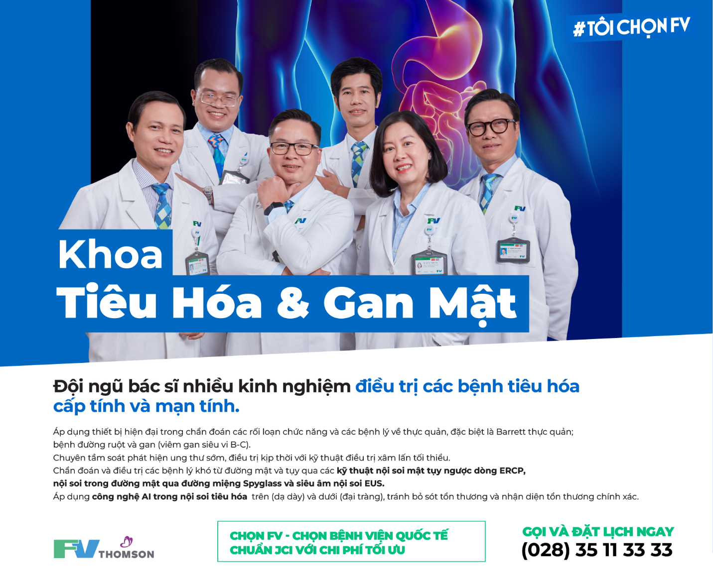 Hãy để đội ngũ bác sĩ giàu kinh nghiệm của Khoa Tiêu Hóa và Gan Mật – Bệnh viện FV đồng hành cùng bạn trên hành trình bảo vệ lá gan khỏe mạnh. Với hệ thống thiết bị hiện đại như FibroScan, EUS, ERCP, nội soi viên nang, cùng phương pháp điều trị đa chuyên khoa cá thể hóa, FV cam kết mang đến cho bạn dịch vụ chăm sóc toàn diện, an toàn và chính xác. Do đó, khi có các biểu hiện của bệnh gan kể trên, bạn có thể liên hệ ngay hotline (028) 35 11 33 33 của FV để được tư vấn và đặt lịch khám sớm nhất.