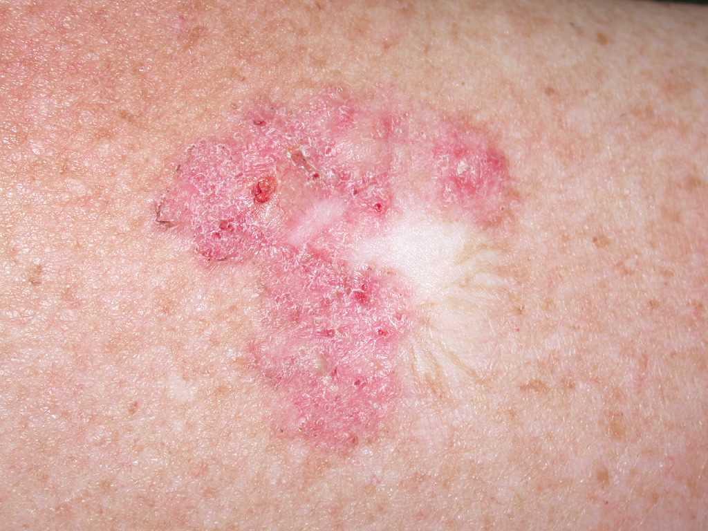 SCC thường xuất hiện dưới dạng mảng sần, có vảy hoặc nốt sừng hóa. Biểu hiện ung thư da có thể là vết loét nông, đôi khi gây đau hoặc rát khi chạm vào. Vị trí thường gặp là vùng da tiếp xúc nhiều với ánh nắng như mặt, tai, cổ tay.