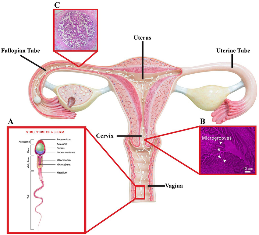 - B: Sự hiện diện của các rãnh siêu nhỏ giúp tinh trùng đi qua cổ tử cung.