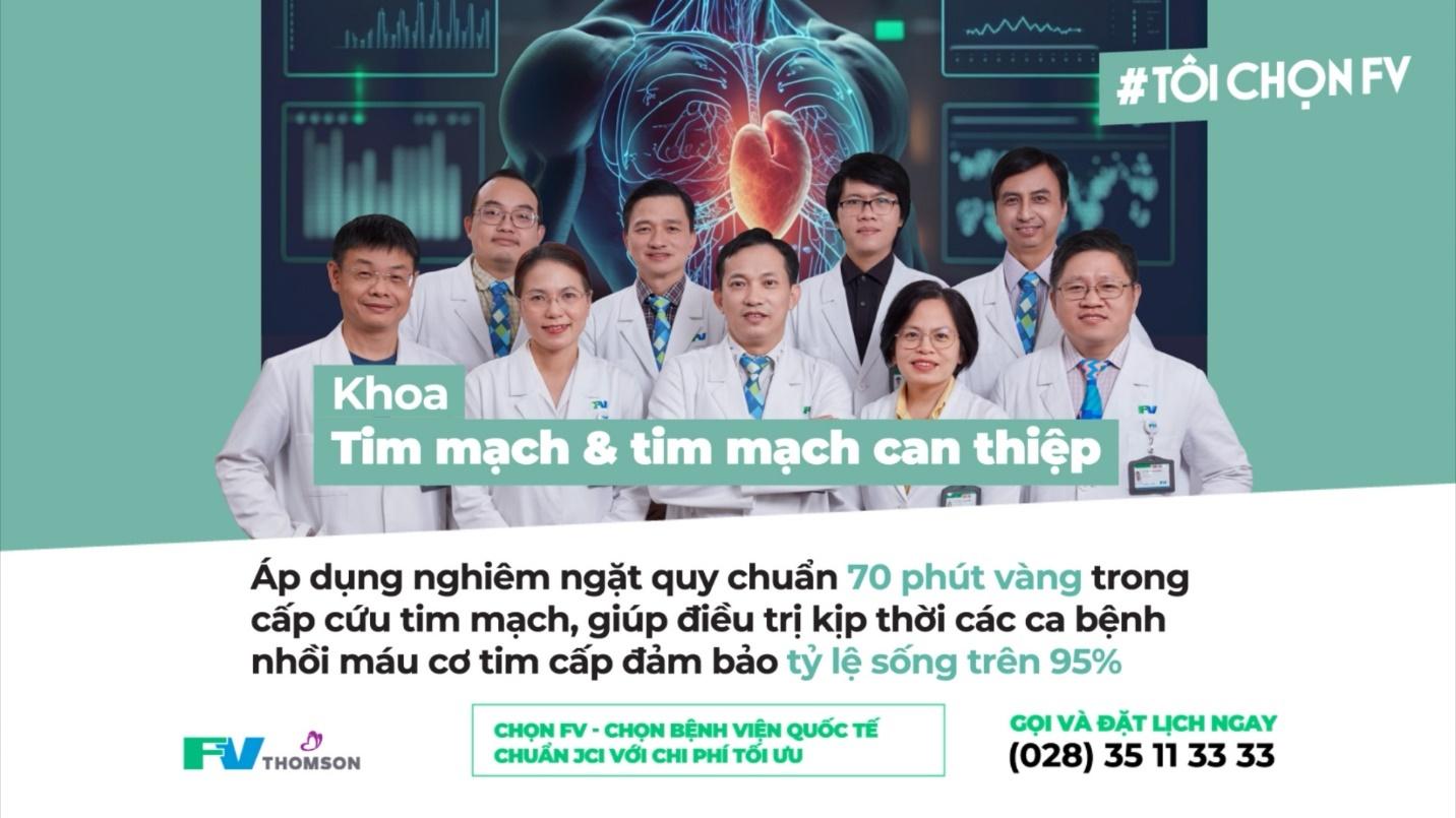 Tại Bệnh viện FV, đội ngũ y bác sĩ không chỉ mang đến dịch vụ y tế chuẩn quốc tế, mà còn đặt cả tâm huyết và nhân văn trong từng quyết định điều trị. Dưới sự dẫn dắt của các chuyên gia tim mạch hàng đầu, với hệ thống trang thiết bị hiện đại và quy trình cấp cứu 24/7, FV cam kết đồng hành cùng người bệnh trên hành trình bảo vệ và hồi phục sức khỏe trái tim – một cách trọn vẹn, chính xác và an toàn.