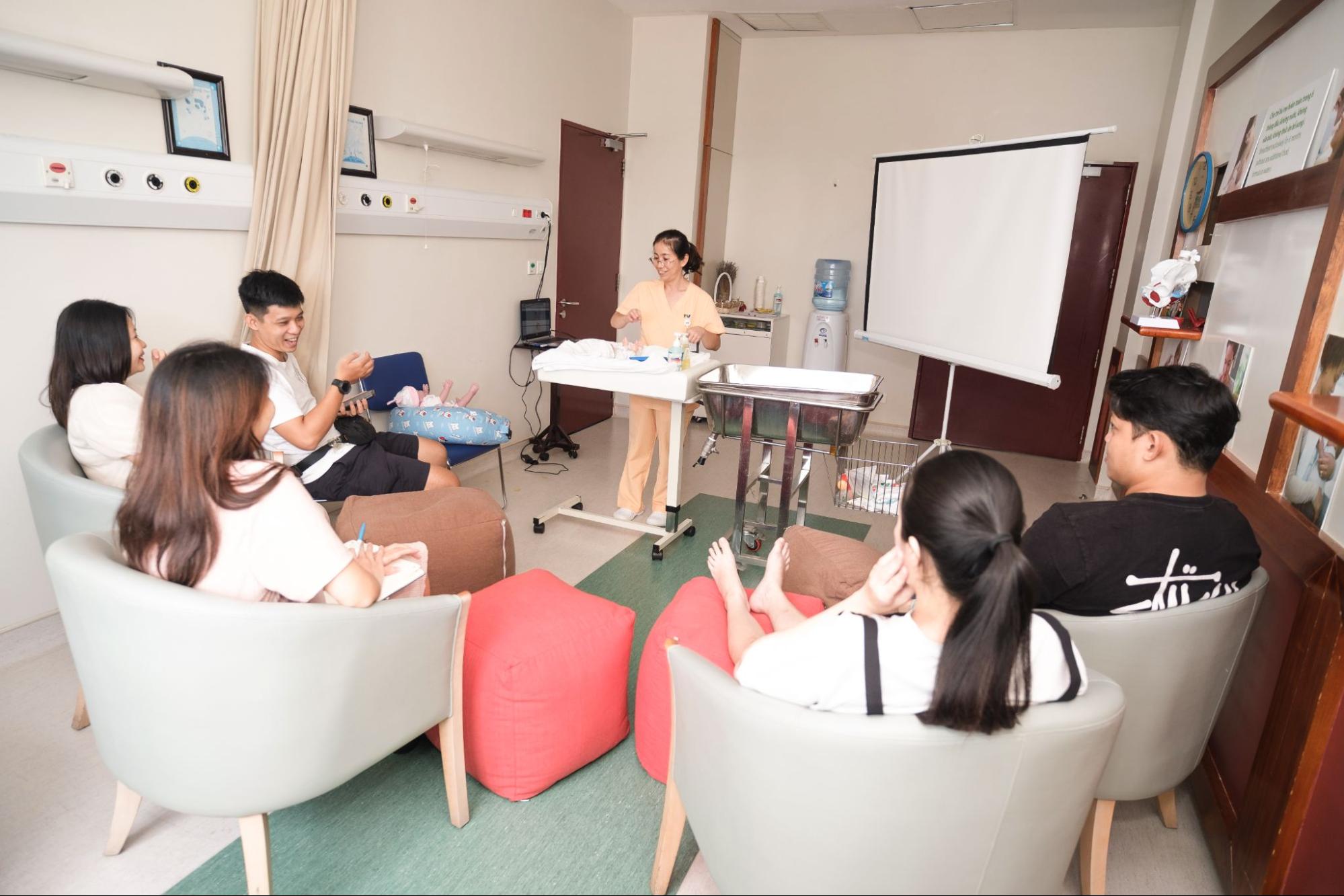 Nhóm lớp học tiền sản này hướng dẫn mẹ chăm sóc sức khỏe sau sinh, từ chế độ ăn uống phục hồi thể lực, chăm sóc vết mổ hoặc tầng sinh môn, cho đến cách nhận diện sớm dấu hiệu trầm cảm sau sinh. Bên cạnh đó, mẹ được học cách tắm bé, thay tã, vệ sinh rốn và xử lý tình huống khi bé khóc kéo dài.