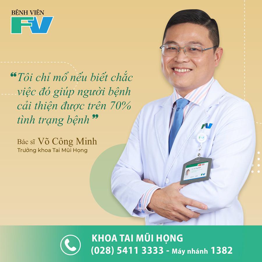 TS.BS. Võ Công Minh, Trưởng khoa Tai Mũi Họng tại Bệnh viện FV chia sẻ, ông luôn đề cao nguyên tắc “3 Đúng” trong điều trị: “Khám đúng bệnh, chữa đúng phương pháp và đúng thời điểm để quá trình điều trị nhanh chóng, mang lại hiệu quả cao.” (Nguồn: Báo Dân Trí)